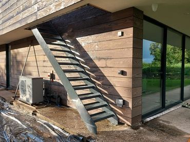 Here at I.C.S we where asked to provide the structure for this fabulous build. As the house itself is a steel framed structure, we where able to provide our services and skills to the project. Over 150 individual pieces of construction steel where produced for immense task, maneuvering each part onto site one by one. Any project would not be a challenge without a few hurdles along the way, however, we are able to over come these and produce a glorious frame for this masterpiece. The External stairs on the project, leading from the ground floor to the open and spacious roof terrace where also manufactured off site and maneuvered into place in one section, the elegant glass balustrade really highlight the beauty of the Shou Sugi Ban cladding.